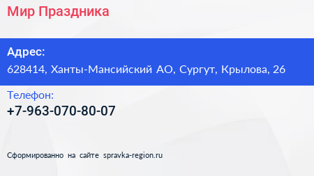 Мир Праздника по адресу 628414, Ханты-Мансийский АО, Сургут, Крылова, 26 в дальнейшем Организация, размещена в следующих категориях: