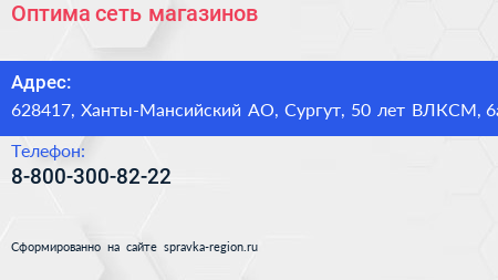 Оптима, сеть магазинов по адресу 628417, Ханты-Мансийский АО, Сургут, 50 лет ВЛКСМ, 6а в дальнейшем Организация, размещена в следующих категориях: