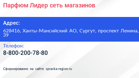 Парфюм-Лидер, сеть магазинов по адресу 628416, Ханты-Мансийский АО, Сургут, проспект Ленина, 39 в дальнейшем Организация, размещена в следующих категориях: