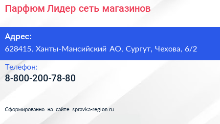 Парфюм-Лидер, сеть магазинов по адресу 628415, Ханты-Мансийский АО, Сургут, Чехова, 6/2 в дальнейшем Организация, размещена в следующих категориях: