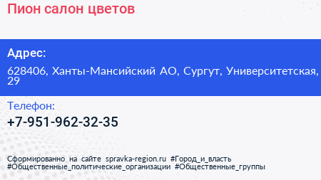 Пион, салон цветов по адресу 628406, Ханты-Мансийский АО, Сургут, Университетская, 29 в дальнейшем Организация, размещена в следующих категориях: