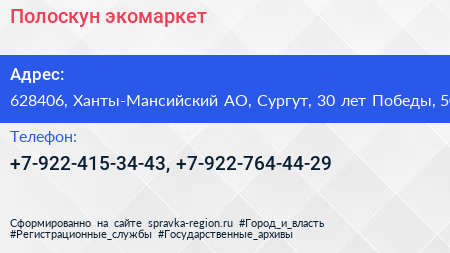 Полоскун, экомаркет по адресу 628406, Ханты-Мансийский АО, Сургут, 30 лет Победы, 50 в дальнейшем Организация, размещена в следующих категориях: