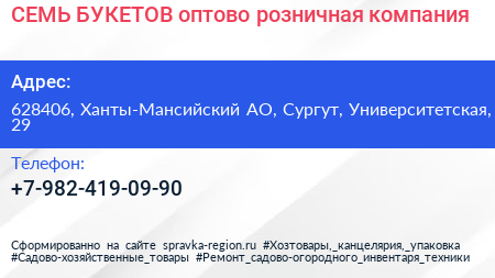 СЕМЬ БУКЕТОВ, оптово-розничная компания по адресу 628406, Ханты-Мансийский АО, Сургут, Университетская, 29 в дальнейшем Организация, размещена в следующих категориях: