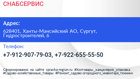 СНАБСЕРВИС по адресу 628401, Ханты-Мансийский АО, Сургут, Гидростроителей, 6 в дальнейшем Организация, размещена в следующих категориях:
