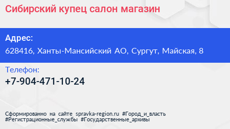 Сибирский купец, салон-магазин по адресу 628416, Ханты-Мансийский АО, Сургут, Майская, 8 в дальнейшем Организация, размещена в следующих категориях: