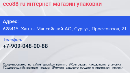 eco88.ru, интернет-магазин упаковки по адресу 628415, Ханты-Мансийский АО, Сургут, Профсоюзов, 21 в дальнейшем Организация, размещена в следующих категориях: