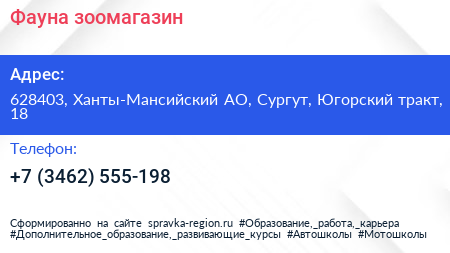 Фауна, зоомагазин по адресу 628403, Ханты-Мансийский АО, Сургут, Югорский тракт, 18 в дальнейшем Организация, размещена в следующих категориях: