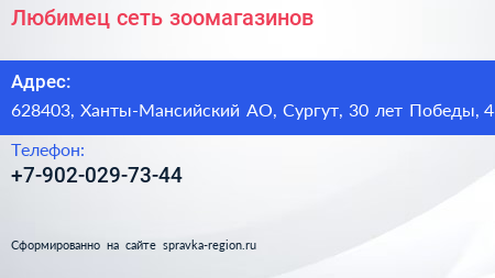 Любимец, сеть зоомагазинов по адресу 628403, Ханты-Мансийский АО, Сургут, 30 лет Победы, 46 в дальнейшем Организация, размещена в следующих категориях:
