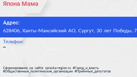 Япона Мама по адресу 628406, Ханты-Мансийский АО, Сургут, 30 лет Победы, 74 в дальнейшем Организация, размещена в следующих категориях: