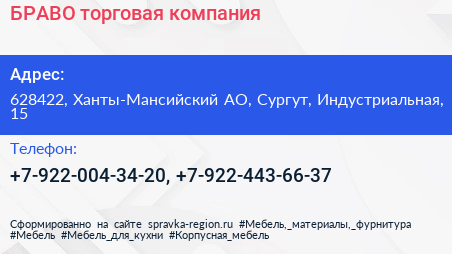БРАВО, торговая компания по адресу 628422, Ханты-Мансийский АО, Сургут, Индустриальная, 15 в дальнейшем Организация, размещена в следующих категориях: