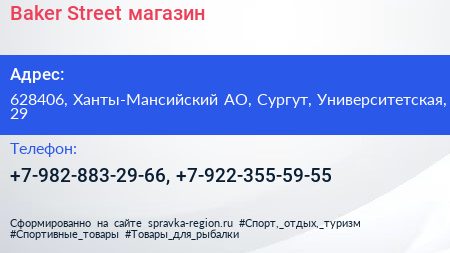 Baker Street, магазин по адресу 628406, Ханты-Мансийский АО, Сургут, Университетская, 29 в дальнейшем Организация, размещена в следующих категориях: