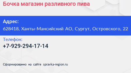 Бочка, магазин разливного пива по адресу 628418, Ханты-Мансийский АО, Сургут, Островского, 22 в дальнейшем Организация, размещена в следующих категориях: