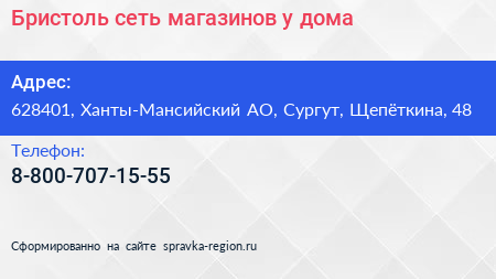 Бристоль, сеть магазинов у дома по адресу 628401, Ханты-Мансийский АО, Сургут, Щепёткина, 48 в дальнейшем Организация, размещена в следующих категориях: