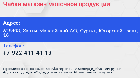 Чабан, магазин молочной продукции по адресу 628403, Ханты-Мансийский АО, Сургут, Югорский тракт, 18 в дальнейшем Организация, размещена в следующих категориях: