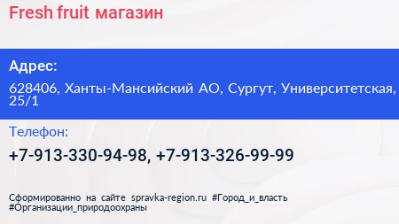 Fresh fruit, магазин по адресу 628406, Ханты-Мансийский АО, Сургут, Университетская, 25/1 в дальнейшем Организация, размещена в следующих категориях: