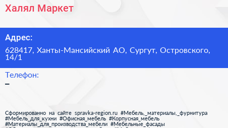 Халял Маркет по адресу 628417, Ханты-Мансийский АО, Сургут, Островского, 14/1 в дальнейшем Организация, размещена в следующих категориях: