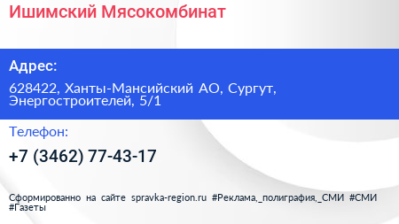 Ишимский Мясокомбинат по адресу 628422, Ханты-Мансийский АО, Сургут, Энергостроителей, 5/1 в дальнейшем Организация, размещена в следующих категориях: