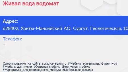 Живая вода, водомат по адресу 628402, Ханты-Мансийский АО, Сургут, Геологическая, 10 в дальнейшем Организация, размещена в следующих категориях: