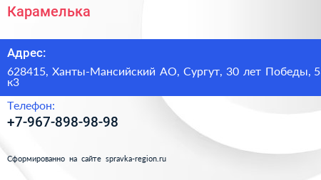 Карамелька по адресу 628415, Ханты-Мансийский АО, Сургут, 30 лет Победы, 53 к3 в дальнейшем Организация, размещена в следующих категориях: