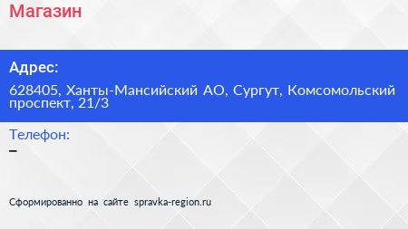 Магазин по адресу 628405, Ханты-Мансийский АО, Сургут, Комсомольский проспект, 21/3 в дальнейшем Организация, размещена в следующих категориях: