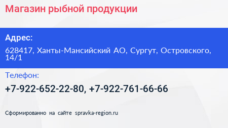 Магазин рыбной продукции по адресу 628417, Ханты-Мансийский АО, Сургут, Островского, 14/1 в дальнейшем Организация, размещена в следующих категориях: