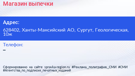Магазин выпечки по адресу 628402, Ханты-Мансийский АО, Сургут, Геологическая, 10ж в дальнейшем Организация, размещена в следующих категориях: