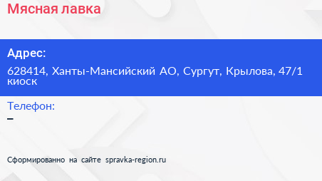 Мясная лавка по адресу 628414, Ханты-Мансийский АО, Сургут, Крылова, 47/1 киоск в дальнейшем Организация, размещена в следующих категориях: