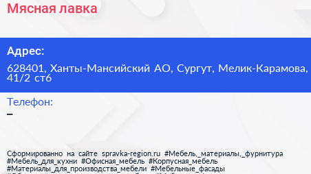 Мясная лавка по адресу 628401, Ханты-Мансийский АО, Сургут, Мелик-Карамова, 41/2 ст6 в дальнейшем Организация, размещена в следующих категориях: