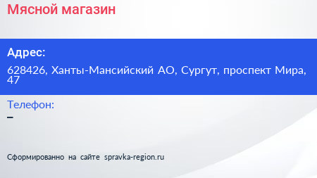 Мясной магазин по адресу 628426, Ханты-Мансийский АО, Сургут, проспект Мира, 47 в дальнейшем Организация, размещена в следующих категориях: