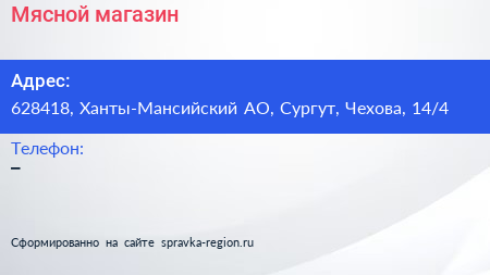 Мясной магазин по адресу 628418, Ханты-Мансийский АО, Сургут, Чехова, 14/4 в дальнейшем Организация, размещена в следующих категориях: