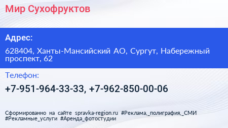 Мир Сухофруктов по адресу 628404, Ханты-Мансийский АО, Сургут, Набережный проспект, 62 в дальнейшем Организация, размещена в следующих категориях: