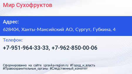 Мир Сухофруктов по адресу 628404, Ханты-Мансийский АО, Сургут, Губкина, 4 в дальнейшем Организация, размещена в следующих категориях:
