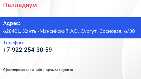 Палладиум по адресу 628401, Ханты-Мансийский АО, Сургут, Сосновая, 6/30 в дальнейшем Организация, размещена в следующих категориях: