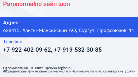 Paronormalno, вейп-шоп по адресу 628415, Ханты-Мансийский АО, Сургут, Профсоюзов, 11 в дальнейшем Организация, размещена в следующих категориях: