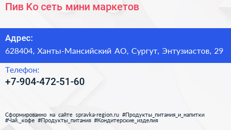 Пив & Ko, сеть мини-маркетов по адресу 628404, Ханты-Мансийский АО, Сургут, Энтузиастов, 29 в дальнейшем Организация, размещена в следующих категориях: