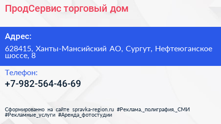 ПродСервис, торговый дом по адресу 628415, Ханты-Мансийский АО, Сургут, Нефтеюганское шоссе, 8 в дальнейшем Организация, размещена в следующих категориях: