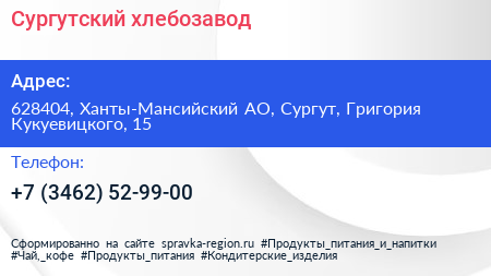 Сургутский хлебозавод по адресу 628404, Ханты-Мансийский АО, Сургут, Григория Кукуевицкого, 15 в дальнейшем Организация, размещена в следующих категориях: