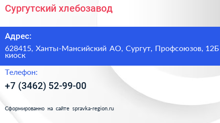 Сургутский хлебозавод по адресу 628415, Ханты-Мансийский АО, Сургут, Профсоюзов, 12Б киоск в дальнейшем Организация, размещена в следующих категориях: