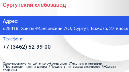 Сургутский хлебозавод по адресу 628418, Ханты-Мансийский АО, Сургут, Бажова, 27 киоск в дальнейшем Организация, размещена в следующих категориях: