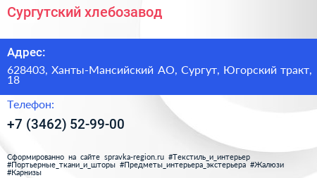 Сургутский хлебозавод по адресу 628403, Ханты-Мансийский АО, Сургут, Югорский тракт, 18 в дальнейшем Организация, размещена в следующих категориях: