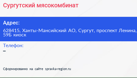 Сургутский, мясокомбинат по адресу 628415, Ханты-Мансийский АО, Сургут, проспект Ленина, 59Б киоск в дальнейшем Организация, размещена в следующих категориях: