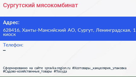 Сургутский, мясокомбинат по адресу 628416, Ханты-Мансийский АО, Сургут, Ленинградская, 1 киоск в дальнейшем Организация, размещена в следующих категориях: