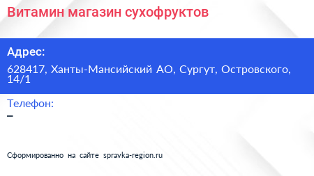 Витамин, магазин сухофруктов по адресу 628417, Ханты-Мансийский АО, Сургут, Островского, 14/1 в дальнейшем Организация, размещена в следующих категориях: