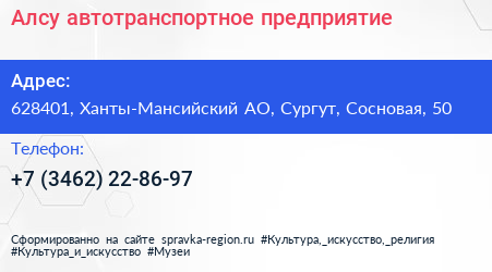 Алсу, автотранспортное предприятие по адресу 628401, Ханты-Мансийский АО, Сургут, Сосновая, 50 в дальнейшем Организация, размещена в следующих категориях: