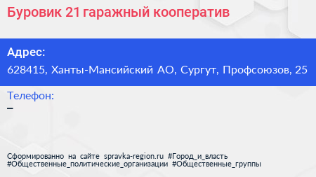 Буровик 21, гаражный кооператив по адресу 628415, Ханты-Мансийский АО, Сургут, Профсоюзов, 25 в дальнейшем Организация, размещена в следующих категориях: