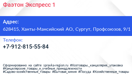 Фаэтон-Экспресс-1 по адресу 628415, Ханты-Мансийский АО, Сургут, Профсоюзов, 9/1 в дальнейшем Организация, размещена в следующих категориях: