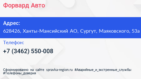 Форвард-Авто по адресу 628426, Ханты-Мансийский АО, Сургут, Маяковского, 53а в дальнейшем Организация, размещена в следующих категориях: