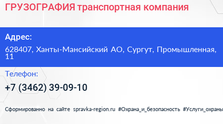 ГРУЗОГРАФИЯ, транспортная компания по адресу 628407, Ханты-Мансийский АО, Сургут, Промышленная, 11 в дальнейшем Организация, размещена в следующих категориях: