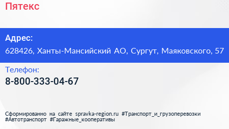 Пятекс по адресу 628426, Ханты-Мансийский АО, Сургут, Маяковского, 57 в дальнейшем Организация, размещена в следующих категориях: