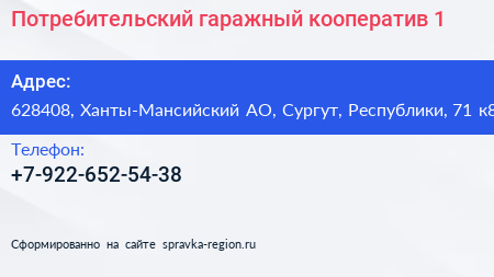 Потребительский гаражный кооператив №1 по адресу 628408, Ханты-Мансийский АО, Сургут, Республики, 71 к8 в дальнейшем Организация, размещена в следующих категориях: